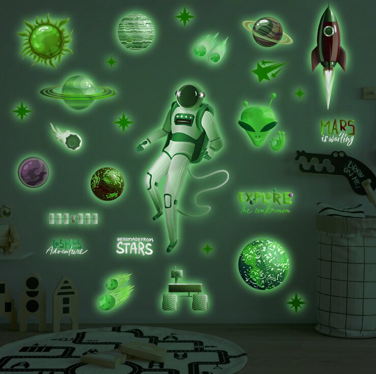 卡通夜光宇航员贴纸外星人儿童房星球墙贴防水可移除装饰自粘贴。热门设计联盟服务商