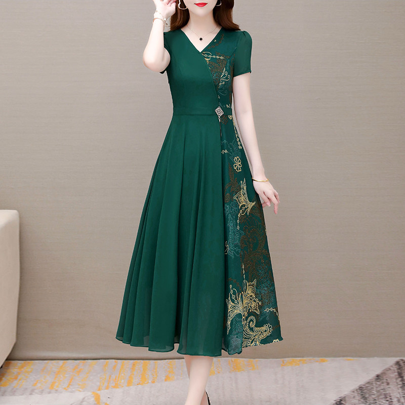 雪纺拼接复古印花连衣裙2021夏新款气质贵夫人高端撞色设计感裙子热门设计联盟服务商