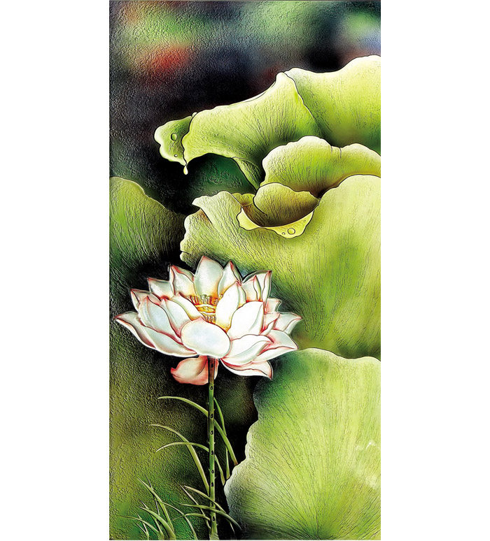 定做钢化艺术玻璃玄关隔断屏风亭亭玉立横幅竖幅细长雕刻甘露荷花热门设计联盟服务商